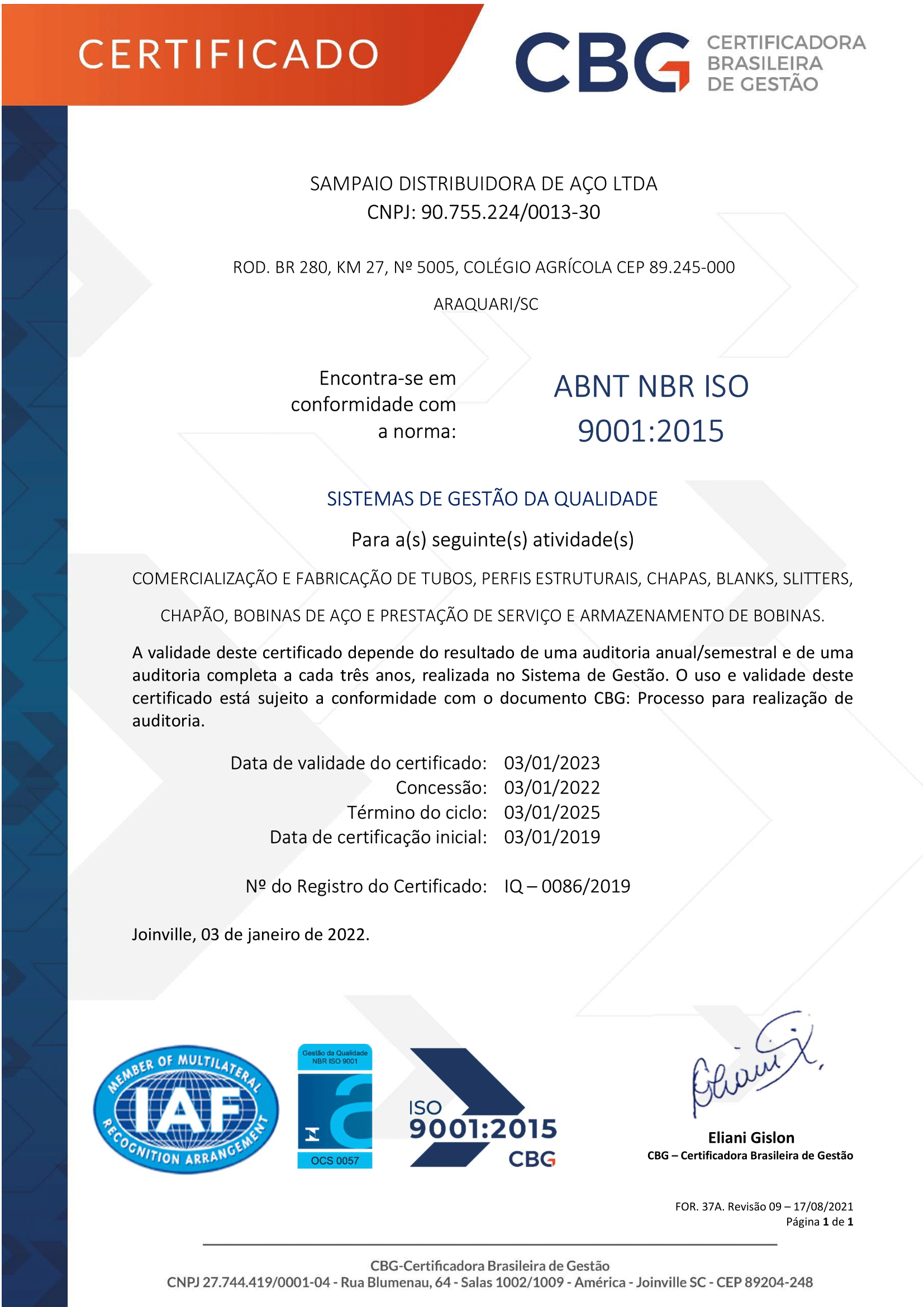 Certificada desde 2018, está comprometida com o mercado consumidor de aço e todos os clientes e parceiros, visando o crescimento e solidez da organização.